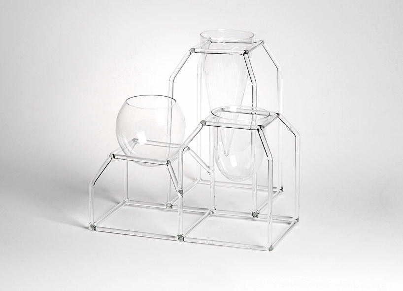 three micro architectures take shape as a series of ‘shelters’, joined as a communal unit. the ordered and consistent intersections are interrupted by bold and floating shapes. together they form a collective geometry to become three vases of different heights.