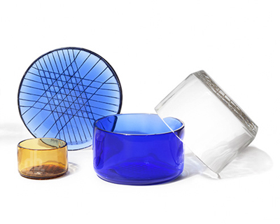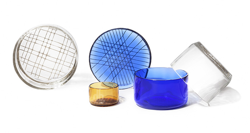 this collection of ‘tartan glass’ by italian designer chiara andreatti forms a fusion between the traditional craftsmanship of blown work and the industrial precision of metal photo engraving. creating strong graphical imprints on the base of each object – metal nets are ‘dipped’ onto the bottom of each piece to create a plaid embellishment.