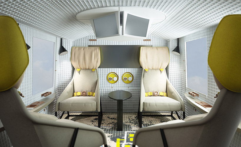 the interior is meant to break the boundaries of the standard VIP helicopter flight experience. in order to do so, the concept of ‘a statified world’ sees different aspects of design layered on top of one another, from interior architecture to the adaptation of home appliances such as LG’s curved LED TV technology to create an immersive total flying experience. their wide-reaching research saw the application of noise-absorbing paint, the construction of full-scale ergonomic mock-ups, carbon fiber armchairs, custom designed headphones, and important innovations such as the use of airbags to protect luggage in the hold.