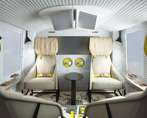 giopato & coombes, selected by giulio cappellini, have taken part in the ‘flydeas for the city’ workshop by agustawestland. the brief called the studio to design an interior for the anglo-italian helicopter company’s AW169, a two-engine commercial rotorcraft. following the huge success of the exhibition held in milan, italy during the furniture fair, the duo are presenting a virtual tour of the project on their website and social channels.