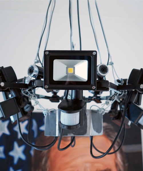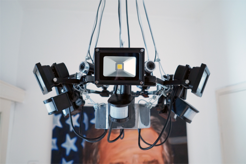 designer iftach gazit has used this concept for the basis of his ‘panopticon chandelier’ which uses LED floodlights and webcams tied together in order to watch your every move. the idea was to create a 3D representation of our current security focused world, where our actions and observations are constantly observed. our relationship with the device blurs the line between our own personal sense of security and privacy. everyday we reveal much about ourselves, from what we buy and where we go, which allows corporations to gather more and more information from consumers. the installation draws upon these themes, by building upon the ‘panopticon’ in a modern and relevant representation.