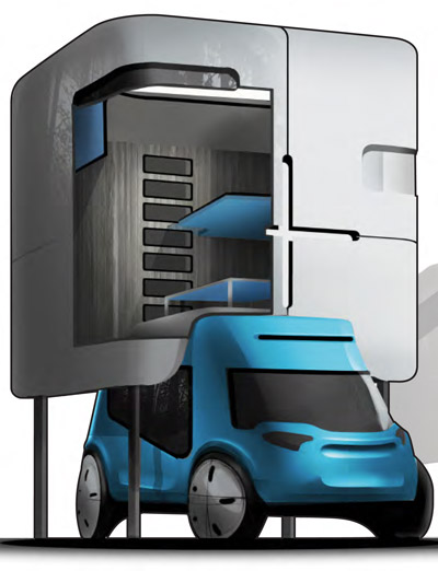 concept diagram of the energy sharing between the structures, making use of solar panels, wind energy, and fuel cells