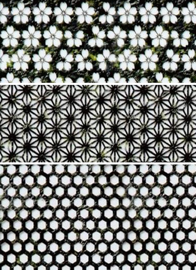 from left to right: ‘sakura’ (‘cherry blossoms’), ‘asanoha’ (‘hemp’), and ‘kikkou’ (‘turtle shell’)