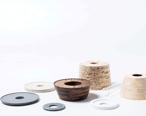 the multi-material volumes come in 4 different sizes: a vase for a single flower, for a larger bouquet or one suitable for a small potted plant, all combining natural materials such as bamboo and chipboard with corean, which has been manipulated to resemble stone. each object has been built layer-by-layer to form a singular rich and vivid texture throughout. the collection is presented during london design festival 2014 at 19 greek street gallery.