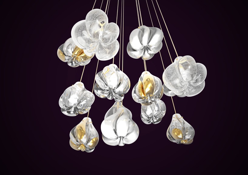 the design of the installation draws influence from the night-sky, as well as the organic form of flowers. looking closely, there are five variations of the pendants; frosted glass, opaque, sanded, clear and some enhanced by using metallic paint. the immersive installation celebrates lasvit’s glass-blowing techniques which originate from the czech republic; coupled with its natural influences and methods of production, ‘cassia’ can be adapted to any interior environment.