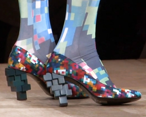 in addition to the clothing pieces, the models donned pixel-patterned jewelry, tights, shoes, and accessories