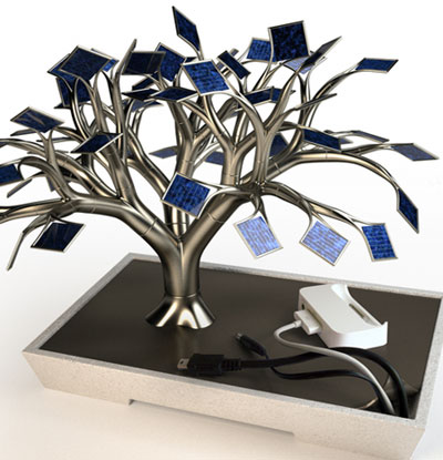 is a metalic bonsai tree – that uses photovoltaic panels to charge mobile devices such as cell phones, MP3 players, digital cameras etc. the modular nature of the design allows the user to model the tree as they prefer.