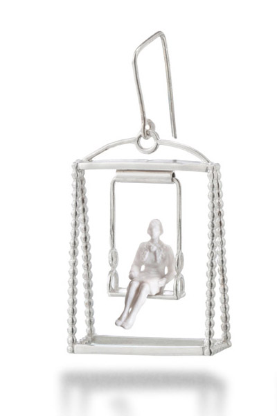 silver swing earrings with miniature male and female figures