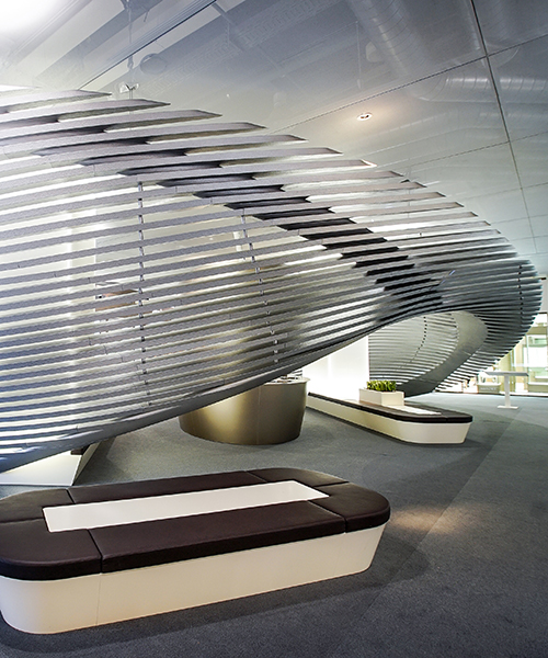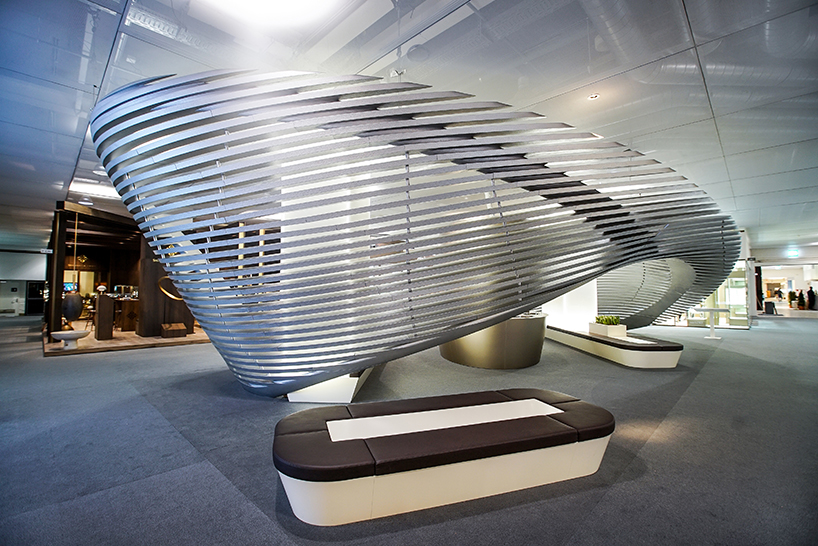 british architect zaha hadid has realized a dynamic installation for danish design house georg jensen, marking their collaboration on a collection of jewelry. at baselworld 2016, an international marketplace and trendsetting show for the watch and jewelry industries, hadid has created a site-specific sculptural structure that serves as the backdrop for an informal guest lounge. a sweeping silhouette of silver fins undulates above visitors and wraps around architectural supports, while free-form seating arrangements offer a destination that is both inviting and relaxing.