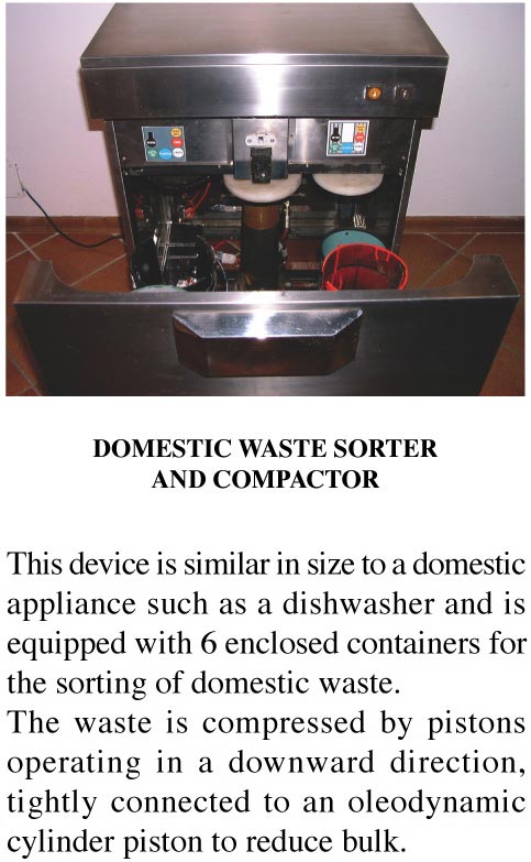 this device is similar in size to a domestic appliance such as a dishwasher and is equipped with six enclosed containers for the sorting of domestic waste. the waste is compressed by pistons operating in a downward direction, tightly connected to an oleodynamic cylinder piston to reduce bulk.