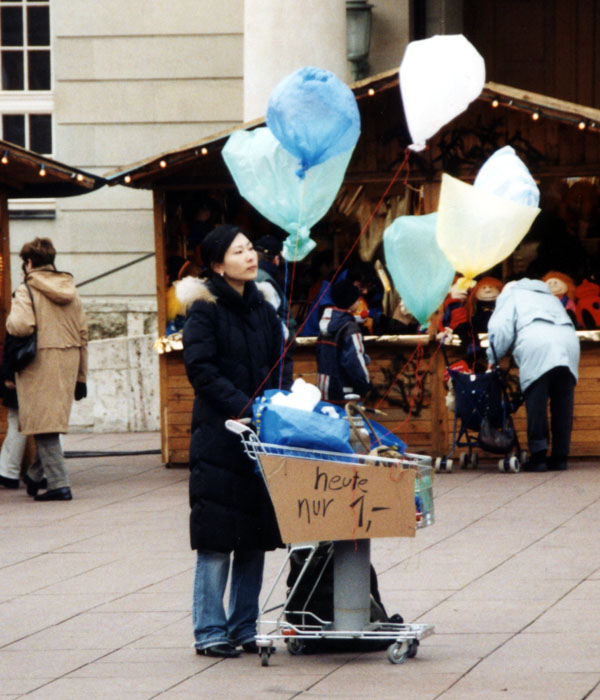 I sold rubbish bags filled with helium to the people visting the Christmas market. The “balloons” are a strange happening and afterwards helpful to carry the waste and garbage.