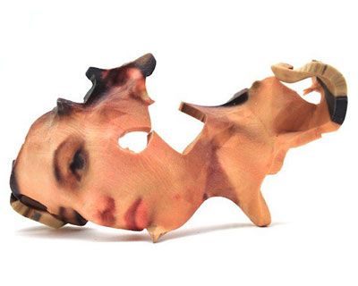 the result is a series of mask-like sculptures, with characteristics unique to each computer platform used — one of the pieces used an autodesk program as its modifier, which turns photographs into 3D models to be printed. the outcome manipulated the facial elements into unusually shaped representations of themselves. another study, whose output method was cubify, is a highly abstracted, geometric reinterpretation of the human face. influenced by our technology driven society, barnshaw’s survey explores the constant supply of digital advances and its assimilation into daily life.