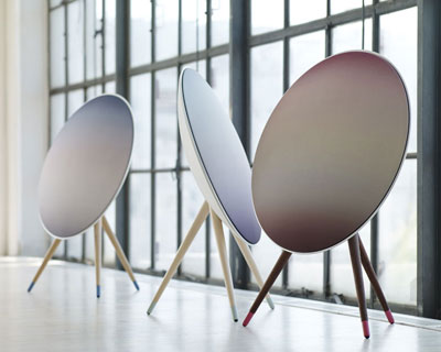 bang & olufsen has designed a limited edition series of wireless speakers called nordic sky for their A9 machine. the gradient pastel chroma of the set represents variations of the color palate of scandinavian summer nights. the speaker systems, which previewed for copenhagen fashion week, are available in three variations: dawn; a turquoise and brown color with beech tree grey feet, twilight; a luminous light and dark blue with oak tree feet, and dusk; light brown and pink with walnut tree pink feet. the elegant circular forms may look pretty, but they are also packed with superior sound power — the A9 boasts 480-watt (x5) 2.1 stereo output, and DLNA and airplay listen anytime without any wires and cables.