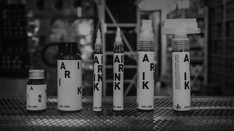 the inks are now available to the masses in the form of 2mm round tip and 15mm, 30mm and 50mm chisel tip markers, and screen printing ink. with a full set being equal to approximately 19.6 hours of diesel car pollution, AIR-INK’s materials are literally making our streets more beautiful.
