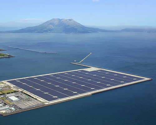 ‘kagoshima nanatsujima mega solar power plant’ sits off the coast of southern japan, overlooking the ocean bay and grand sakurajima volcano. occupying 1.27 million square meters — roughly the same area as 27 baseball stadiums — the massive plant is comprised of 290,000 arranged panels. an adjacent tour facility provides visitors, students, and tourists with expansive panoramas of the facility from a circular viewing room and relevant information about environmental issues, a stimulus in the understanding of renewable energy resources for the public sphere.