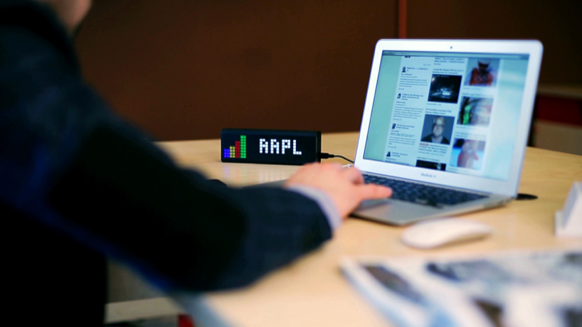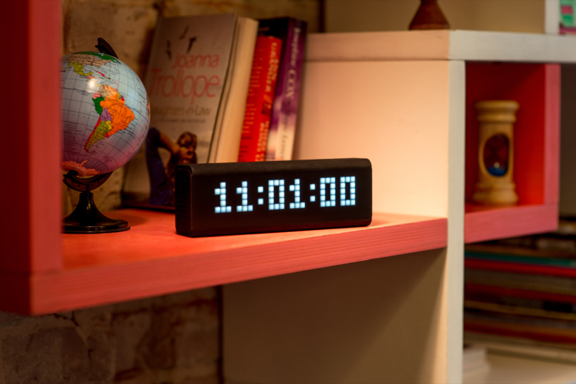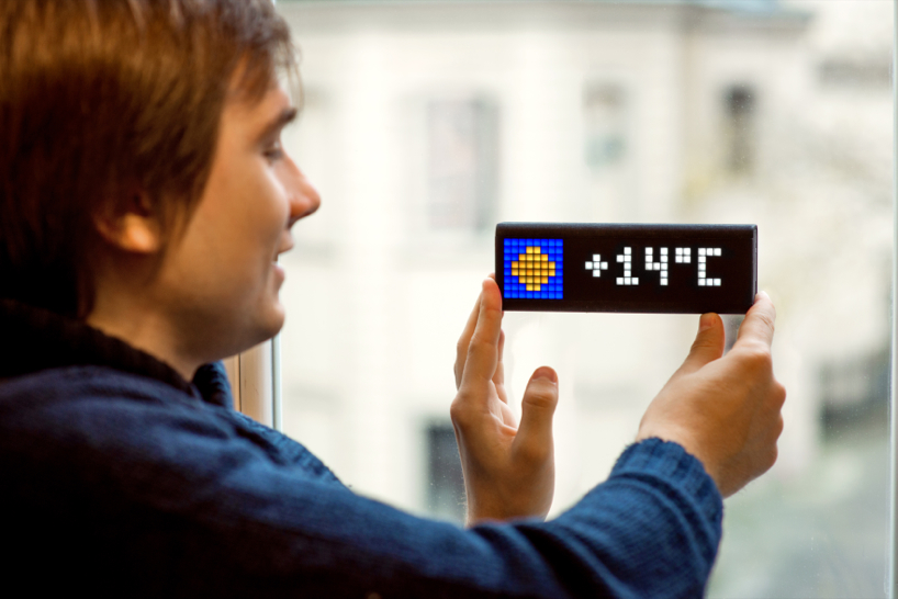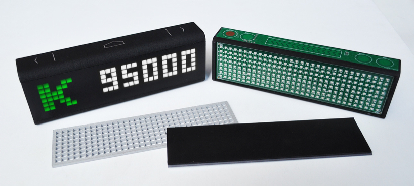 through kickstarter, studio smart atoms introduces ‘LaMetric’, a programmable smart display for the internet of things. the connected device is capable of telling the time, weather and warnings, office meeting information, email and social notifications with subject lines, crossfit timing and fitness goals, to-do lists, stock quotes and much more. pulling information from rss feeds online, ‘lametric’ is also capable of tracking website visitors, conversions and other metrics. for instance, the pixel-based screen can help small businesses grow by engaging with passersby, displaying real-time information such as number of facebook fans, or twitter followers. ‘nike+ fuelband was a huge inspiration at the LaMetric concept stage,’ tells smart atoms to designboom. ‘we wanted to build a screen that looked like was part of the black case when the device was switched off, and when switched on clearly projected the screen across a large physical space with sharp bright square pixels.’