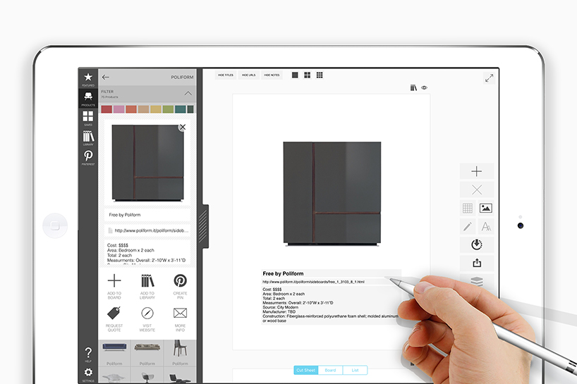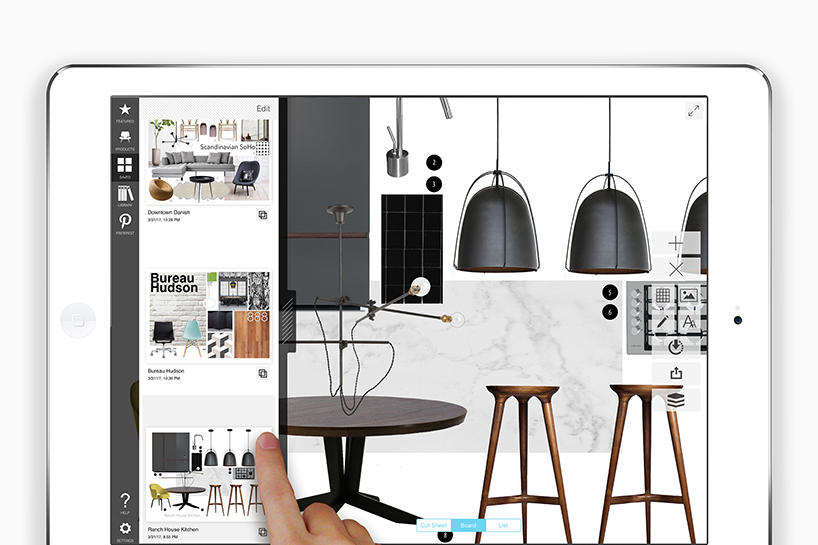 for every interior design project, there are three separate and often tedious steps to make: the mood board for the client, the book of cut sheets and specs for the drawing set, and product list for purchasing. on today’s desktop, each one is independently created by different programs, making it both inefficient and painstaking. between hunting data, laying out images and assembling details, hours pile on, costly mistakes are made and design budgets shrink. hence, AVA program by morpholio lets designers create a mood board of images and quickly flip it over to reveal an editable spreadsheet of its contents; with another flip, one can find a book of customizable cut sheets ready to export or present.