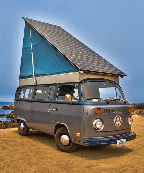 brett belen has been a builder of solar electric vehicles for years, making cars that could be simply refuelled by parking them in the sun. for his most recent project, he chose the iconic volkswagen bus for its interior cabin volume and surface area of its roof. belen imagined a large photovoltaic array that could tilt for maximum solar exposure, soon realizing that the large space beneath the panels could also offer some more elbow room within the vehicle itself.