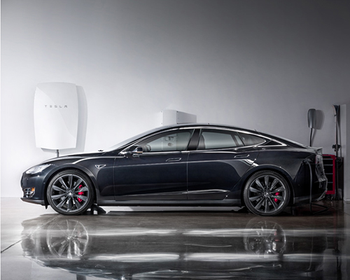 the ‘powerwall’ shares the garage with a tesla ‘model s’