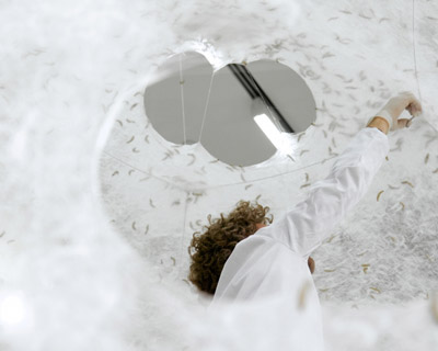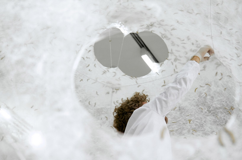 developed by the mediated matter research group at the MIT media lab, ‘the silk pavilion’ explores the relationship between digital and biological fabrication on product and architectural scales. the primary structure was created of 26 polygonal panels made of silk threads laid down by a CNC machine. influenced by the silkworm’s ability to generate a three-dimensional cocoon out of a single multi-property silk thread, the overall geometry of the intervention was created using an algorithm that assigns a single continuous thread across patches providing various degrees of density. a swarm of 6,500 silkworms were positioned at the bottom rim of the scaffold, spinning flat non-woven silk patches as they locally reinforced the gaps across CNC-deposited silk fibers.