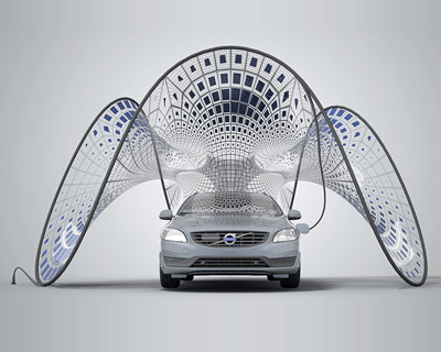 los angeles-based synthesis design + architecture has designed a collapsible tensile membrane structure in form of ‘PURE tension’ for the new volvo V60. the pavilion was commissioned by volvo car italia and brought together the likes of buro happold and fabric images in the creation of an ultra-lightweight, rapidly deployable shelter and charger for the hybrid electric diesel car. in keeping with environmentally-minded measures and a dynamic dialogue between designers, engineers and fabricators, the experimental structure will be composed of recyclable high-density polyethylene and embedded with a pattern of photovoltaic panels that harness sunlight to charge the V60 model. the car is meant to ‘plug’ into the pavilion and co-opt the energy collected that day, in effect reframing the stagnation of the typical trade show shelter into a more integral part of the car’s sustainable features. the flexible membrane is informed by the frei otto’s pioneering fabric constructions and manifests a structural skin as a sequence of hyperbolic curves held in tension by the a carbon fiber tube ring that allows the structure to perfectly fit in the trunk of the car upon disassembly. both the car and pavilion will premier in rome in september 2013.