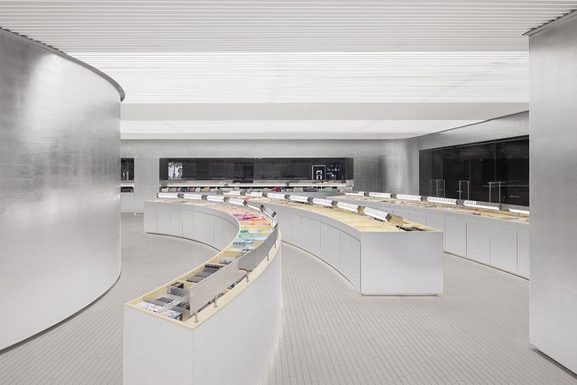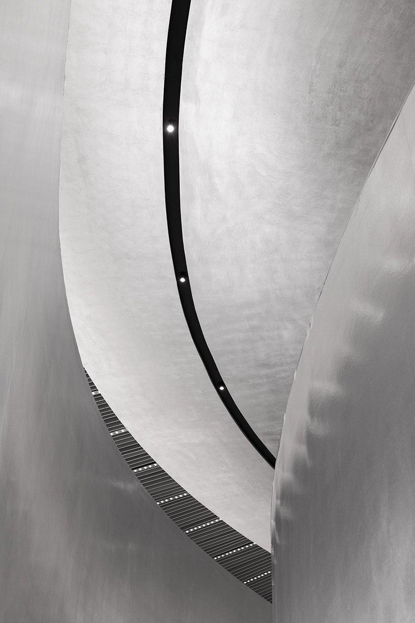 walking up along the spiral stairs, customers will gradually explore the mysterious upper space, which draws them in like a black hole. in order to create a misty, reflective, and soft ambiance in the space, the designers selected materials referring to the texture of aerospace material MLI. with a large area of silver foil setting the overall spatial tone, the pure, natural material textures create fantastic light changes and glittering effects through reflection and refraction. in various arc-shaped spatial volumes, the soft light under multiple reflections generates a pure sense of ritual. these volumes seem to be tough and powerful, but reveal softness and fluidity as customers walk inside, as if being standing in the misty rain.