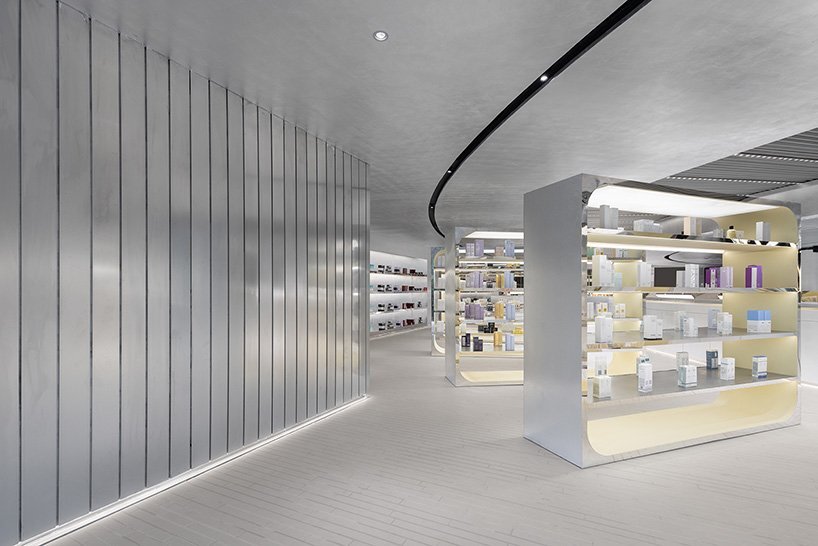 the architects have integrated elements like scattered light strips, linear pendant lights, curved walls, and a large staircase to narrate a story of exploring the unknown. when customers look up towards the newly installed mezzanine level, they find a space that looks like an interstellar track ascending layer by layer. light casts down from the gaps, and moves down along the arc-shaped walls with marvelous shadows. guided by the cashier’s counter and arc-shaped light strips, customers will arrive at the back shopping zone, where lights are mounted in arrays through customized grilles. the combination of arc-shaped showcases and continuous triangular mirrors allows customers to see themselves in the mirrors when trying cosmetics, while adding to the space-inspired look of the interior.