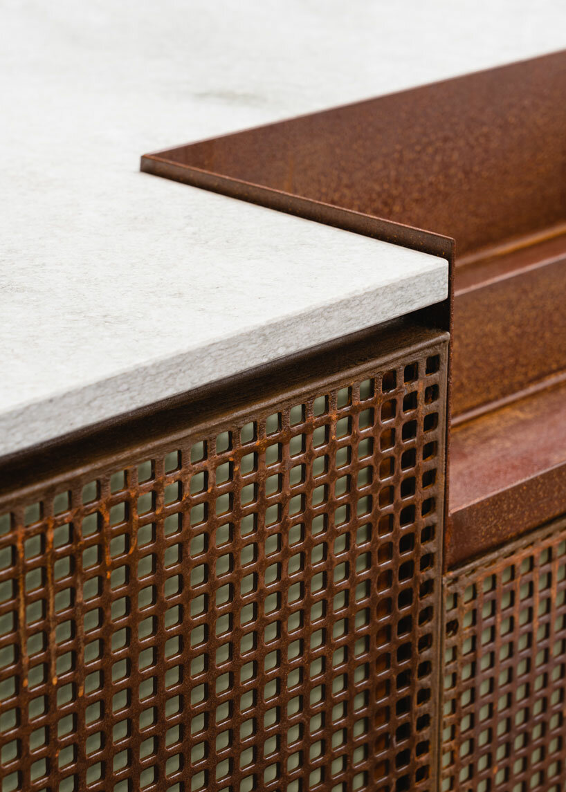 materials: linoleum, corten steel, hpl, plastic mirror, natural stone, fabric, velvet marcus wend