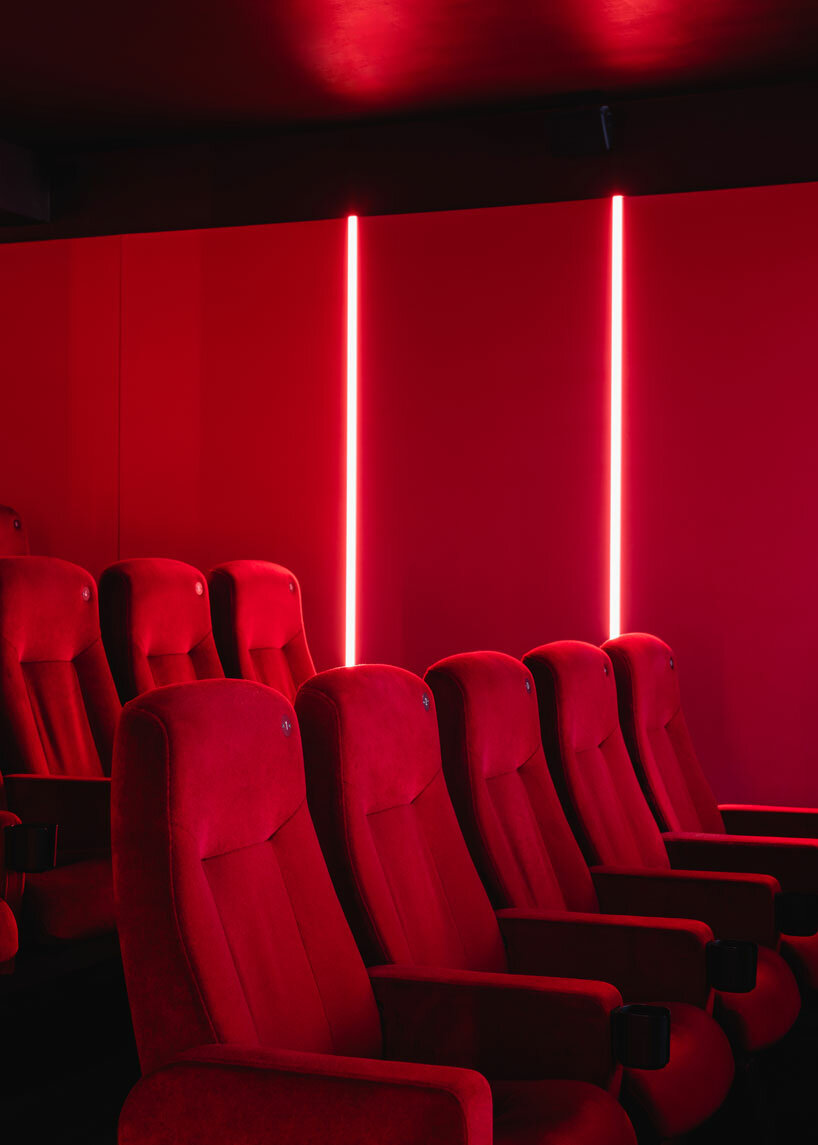 the red auditorium recalls classic cinema interior aesthetics