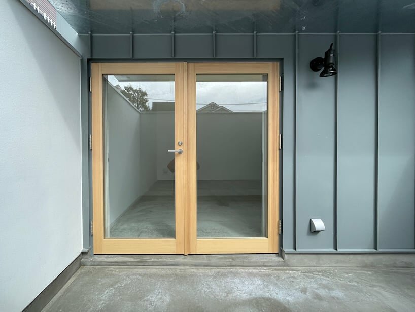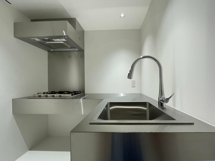 Designer and founder of Studio Blank Tokyo, Hiroaki Taki, completes the refurbishment of a housing unit connecting two lease tenement blocks in Tokyo, Japan. The project, long held due to the lack of wood distribution to the market during the recent pandemic, applies a symmetrical timber truss covering it with an undulating roof system. The covering structure presents a wavy formation on the facade, hiding a set of three elongated skylights made of glass secured in wooden frames. The burr-shaped top scheme follows three different angles for each aperture to ensure northern light distribution throughout the year. The structural elements outlining the interior of ‘atelier aobadai’ are developed with concrete, while the exterior skin lays on metal sheets throughout the outer surfaces.