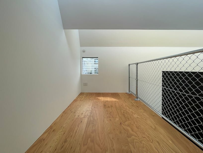 The two dwelling units lay out a symmetrical plan inside the simple cubic volume interconnecting through the common living functions. With no independent entrance area the two residential blocks adjoin the public zones partitioning private mirroring areas. The bedrooms expand vertically in elevated wooden structures extending individual staircases. The stepped structures enclose within a black square wall that stands out as the main feature decorating the interior while retaining privacy. The interior arrangement by Studio Blank Tokyo benefits from the natural light shedding through the inclined skylights.