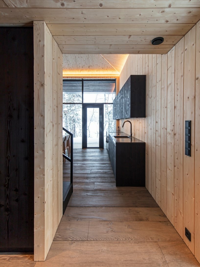 Architectural firm Saukkonen + Partners designs an escape retreat located on a remote island in lakeside Finland, surrounded by nature. Dedicated to a couple’s occasional stay in the rural site, the hideaway cabin is a thought-through entity that adapts to the changing seasons and landscapes. The main cottage and a separate sauna building are carefully positioned on the island. The two separated volumes are connected by their overlapping roof structures. A bridge leading to the island is also a part of the designed whole. The beautiful views of the lake are generally westwards where the sun sets in the evening. The building’s main living spaces and generated views are developed following the sun’s patterns.