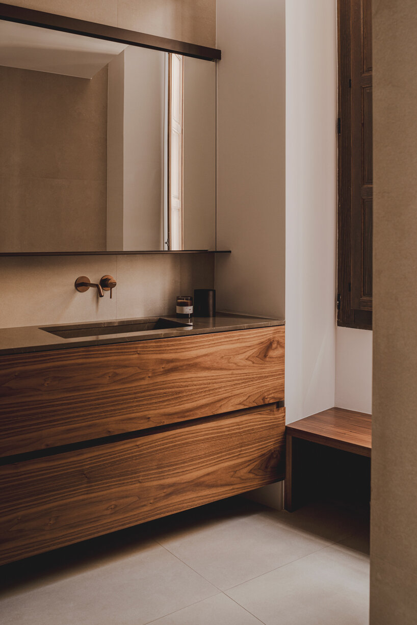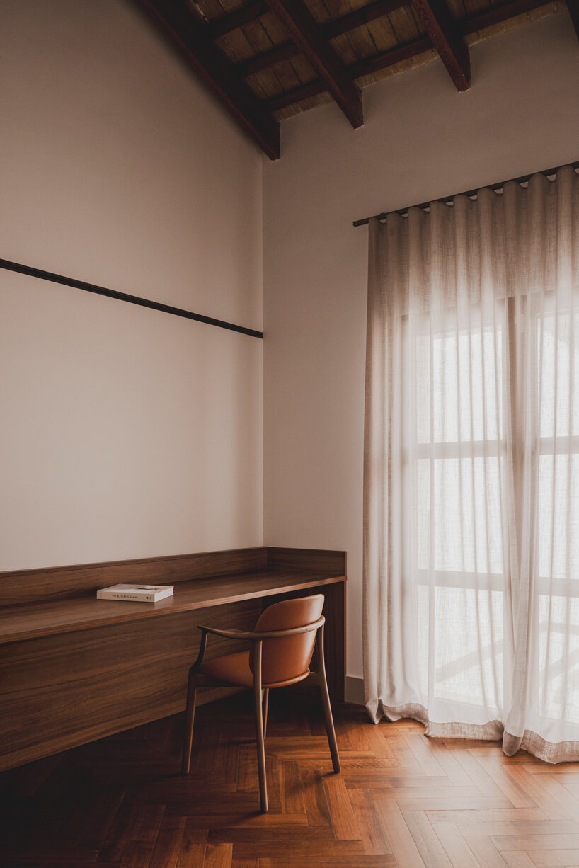 a lightweight steel bookshelf and walnut desk establish a dedicated space for study and work