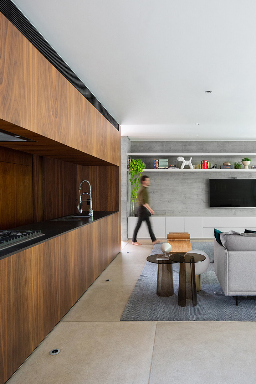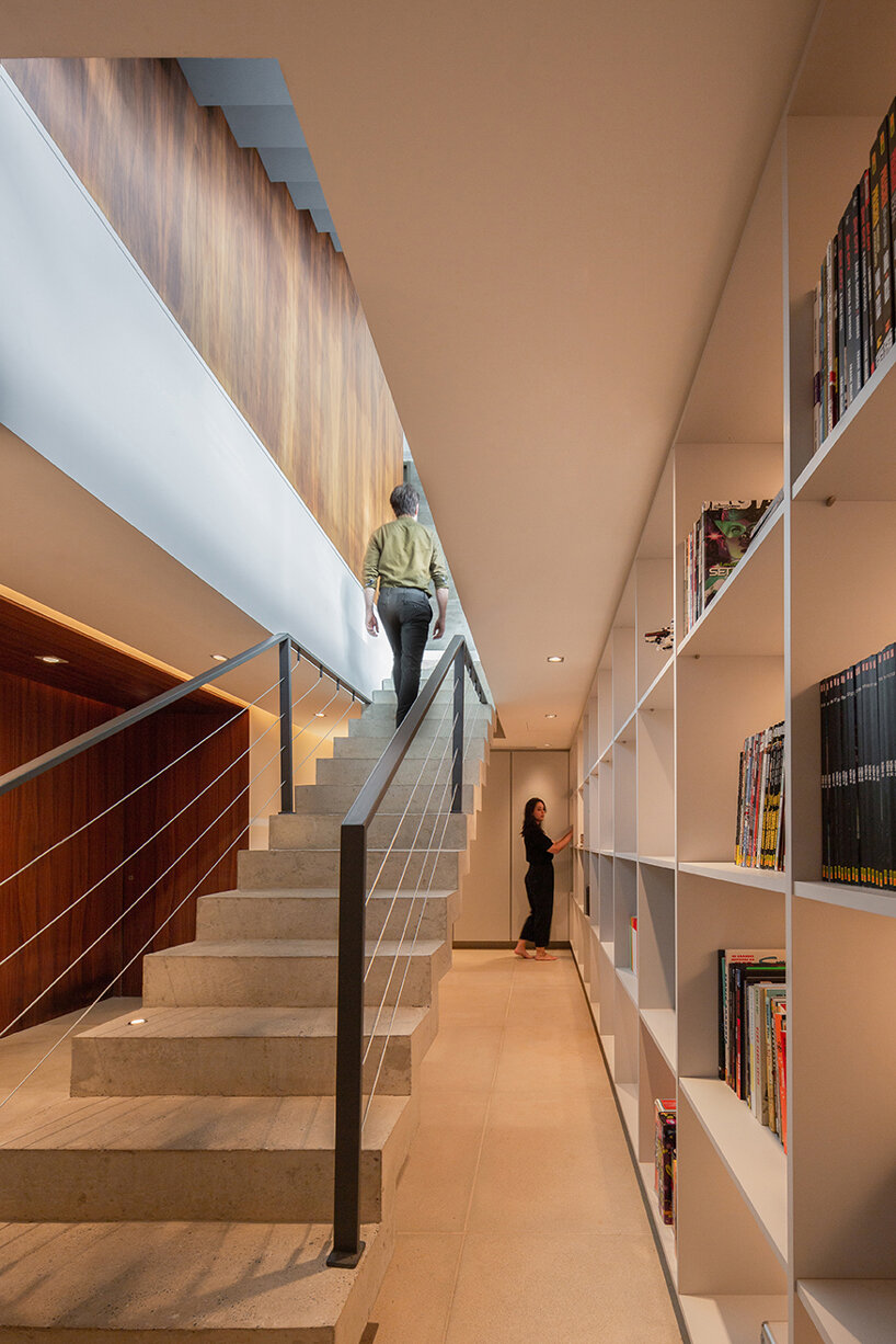 The architects chose ‘sincere’ and ‘unadorned’ materials for Bento House. The ground floor features exposed concrete and timber while the upper level is characterized as a steel container. The operable metal panels have a rusty patina that nicely ties in with the warm wooden finishes.