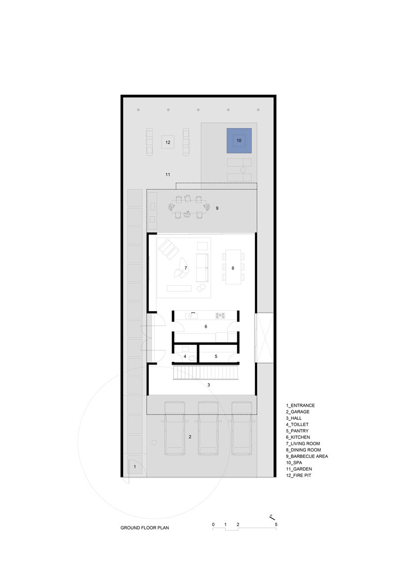 With regard to the program, the ground floor hosts the public functions including an open plan kitchen, living and dining area. This space extends outside to an outdoor dining table on the terrace as well as a small pool, fire pit, and seating area in the garden. The upper floor contains three bedrooms and a home theater while the basement level comprises an additional bedroom as well as a laundry room and other services.