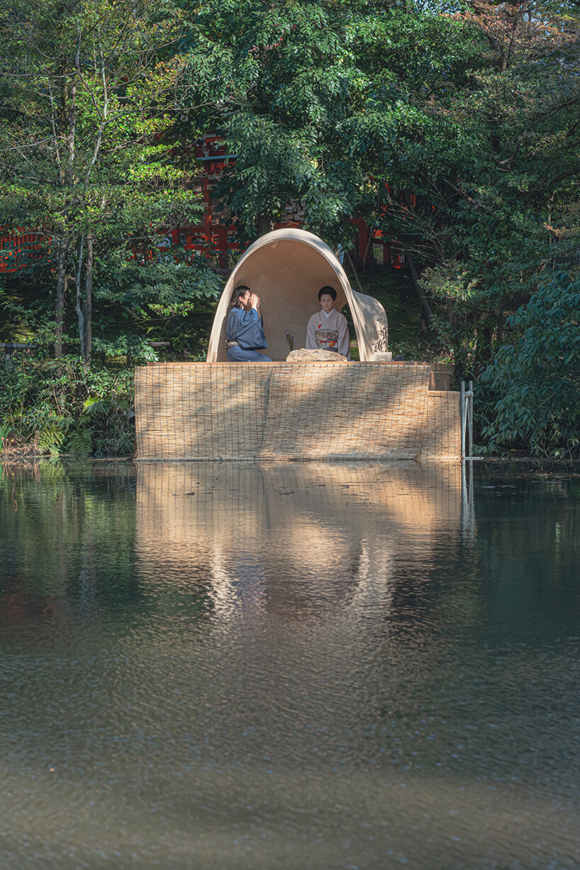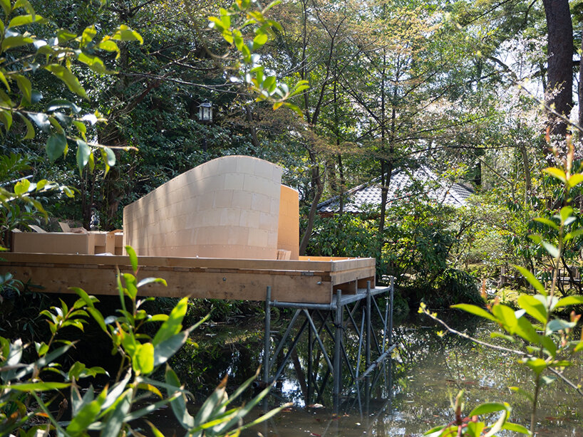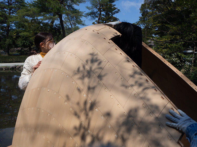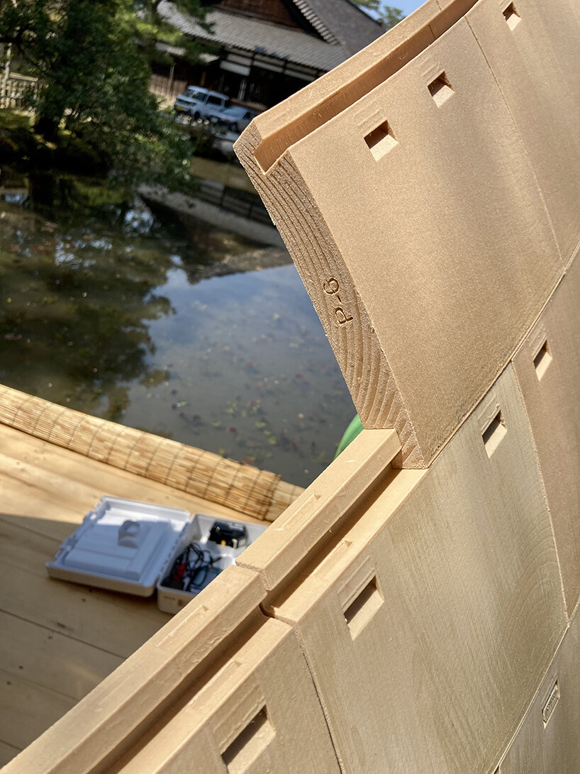 ‘The first stage of research applied to architecture and constructive systems was largely inspired and fueled by traditional Japanese Tsugite and Shiguchi assembly systems for frame structures,’ Kei Atsumi and Nicholas Préaud (see more here) share with designboom. ‘This stage of research and geometric composition was supported by partial prototypes prior to prototyping a complete structure at a 1:1 scale, made possible by investment in 3D printers. The ability to translate digital models into physical objects, whose mechanical behavior could be directly evaluated, was a real asset from the outset and a considerable time saver.‘