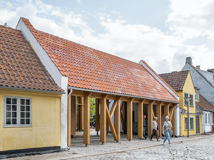 the cylindrical volumes are wrapped in a lattice-like timber framework