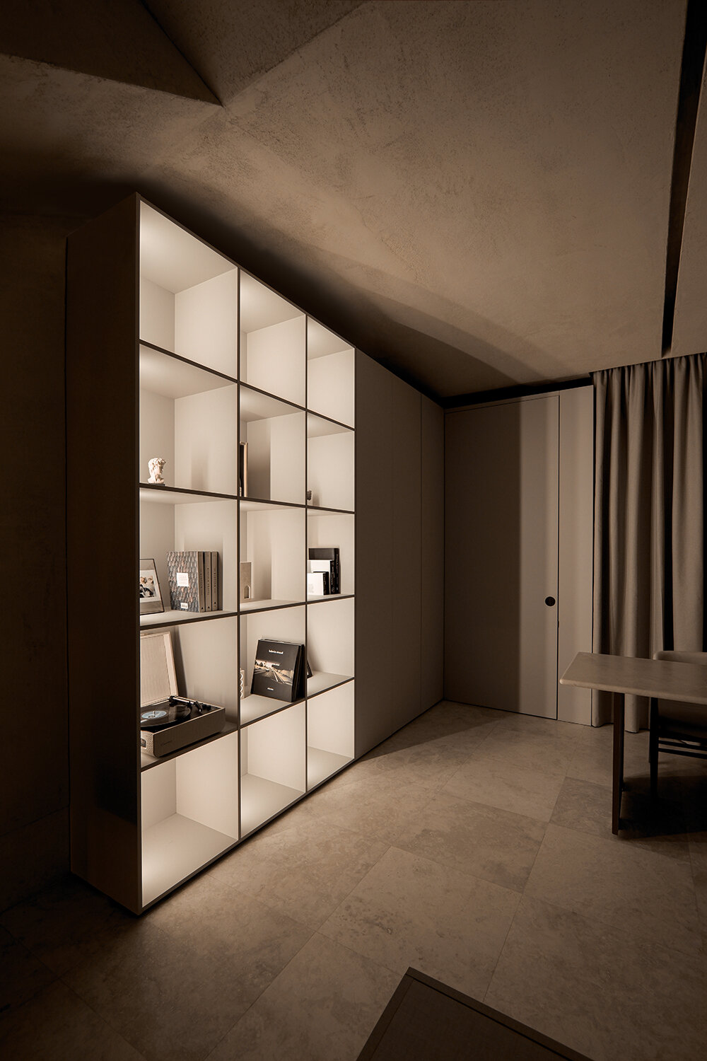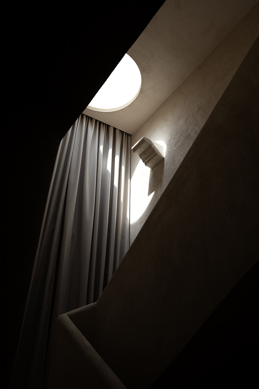 Functionally, the twentyfour dwelling by Maurizio Ascione / 3DM Architecture (see more here) expands onto four levels. The initial tier offers a communal space to residents, connected to the remaining levels via a traditional staircase. Culminating in an overhead skylight, this ascent becomes pivotal for interior illumination. The subsequent level houses private quarters, including bedrooms. Progressing upward, the second floor stands as a zone for an art studio and leisure, opening onto an expansive terrace linked to the rooftop by external stairs. Material-wise, the architect selected a limited palette of stone and concrete, encouraging a balanced contrast of rough and smooth surfaces.