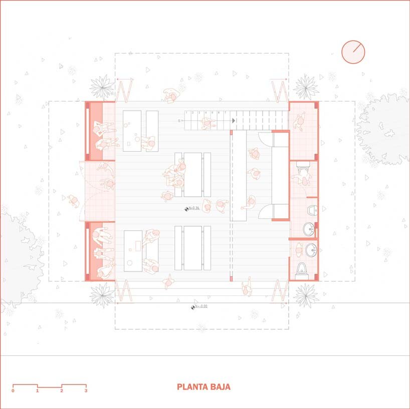 the project envelope is generated by metal folding panels composed of wooden lattices and mosquito nets; a technique that’s used in traditional constructions in the area. its diagonal arrangement improves the stability of the panels, the natural ventilation flow and prevents the entry of insects. once these elements are opened, the center becomes a gateway that links the local population with sports.