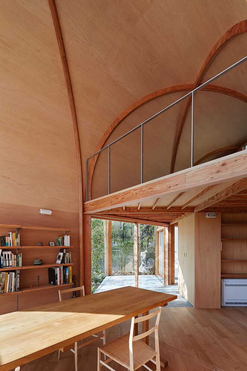 while observing the main road that leads to the site, the team at tomohiro hata found that it was very narrow (about two meters in width) and quite bendy, making it impossible to transport building materials. therefore, the architects started considering a construction that could be assembled and carried by hand, focusing on the arch as a form that can skip spans by combining small pieces. the attention was also shifted to LVL (laminated veneer lumber), a material that can be disassembled and assembled into small, light pieces.