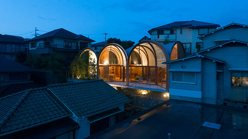 within a landscape of complex retaining walls, staircases, and winding roads, in koyoen, japan, tomohiro hata has built a private residence that blends seamlessly with the flow of the city. the structure integrates arcs, aches, and vaults to follow the shape of the surrounding streets that twist and turn, connecting the site with the rest of the area.