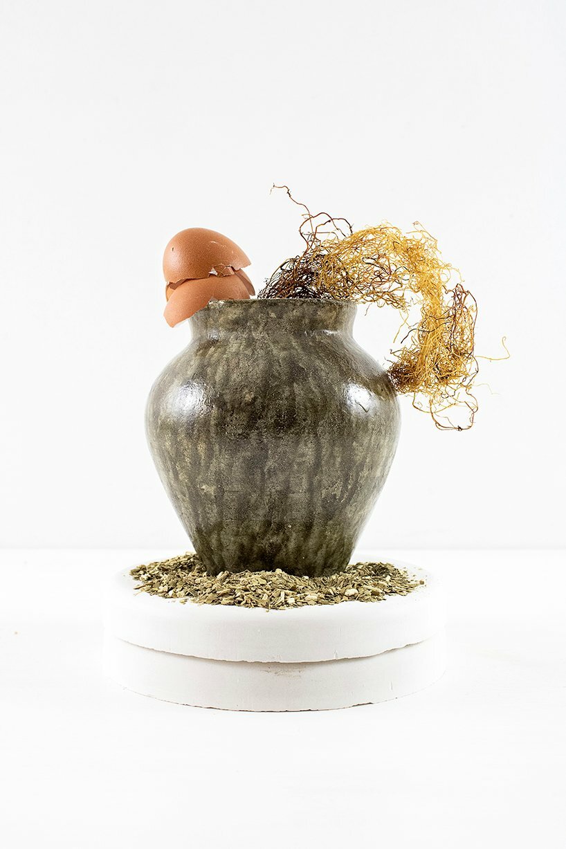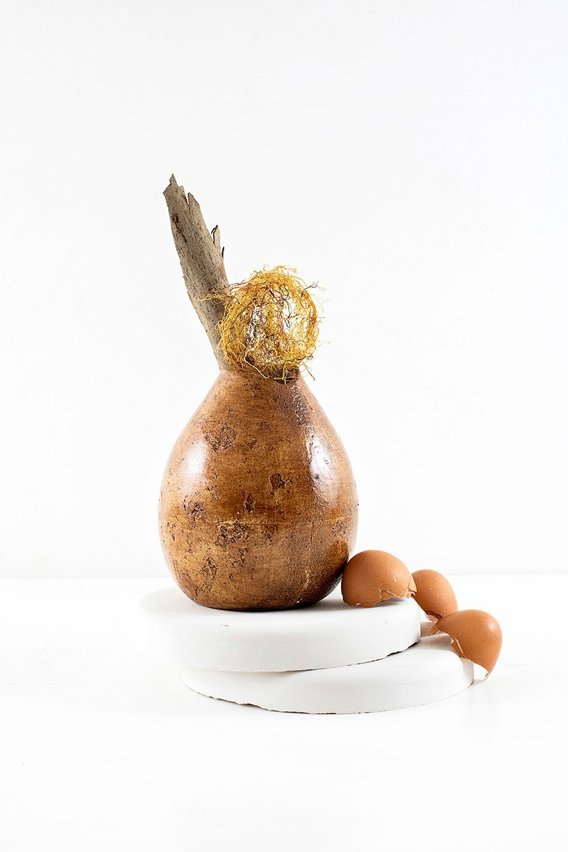 Inspired by biocomposites — a rigid and resistant material — the collection is aptly titled ‘Bioceramics’. Here, Nudel substitutes clay for powdered eggshells found in a local bakery along with sodium alginate from brown algae, and uses calcium carbonate as reinforcement. For the finish of the pieces, traditional ceramic glazes have been replaced with natural pigments made from waste found in the designer’s environment, such as eucalyptus bark or yerba mate remains. Nudel further notes that the most impactful aspect of bioceramics is its drying process which takes place at room temperature, eliminating the need to dry the pieces in a kiln, and largely reducing its environmental impact.