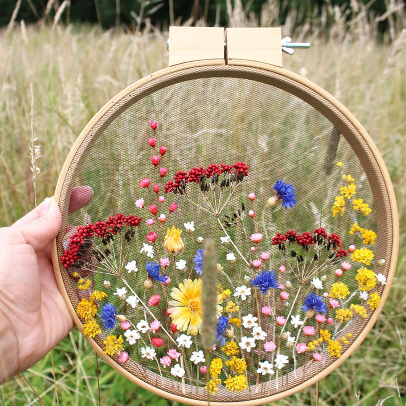 using white tulle as a base, olga prinku attaches the dried flowers to the mesh webbing and shapes elaborate natural motifs, including floral patterns, figurative renderings of birds, as well as individual sprouts. many of her pieces replicate imagery commonly found in eastern european folklore, which the north yorkshire-based artist connects to her early life in the republic of moldova. within prinku’s botanical crafts, one can also find typographic hoops, where preserved flowers are neatly arranged in monograph configurations.