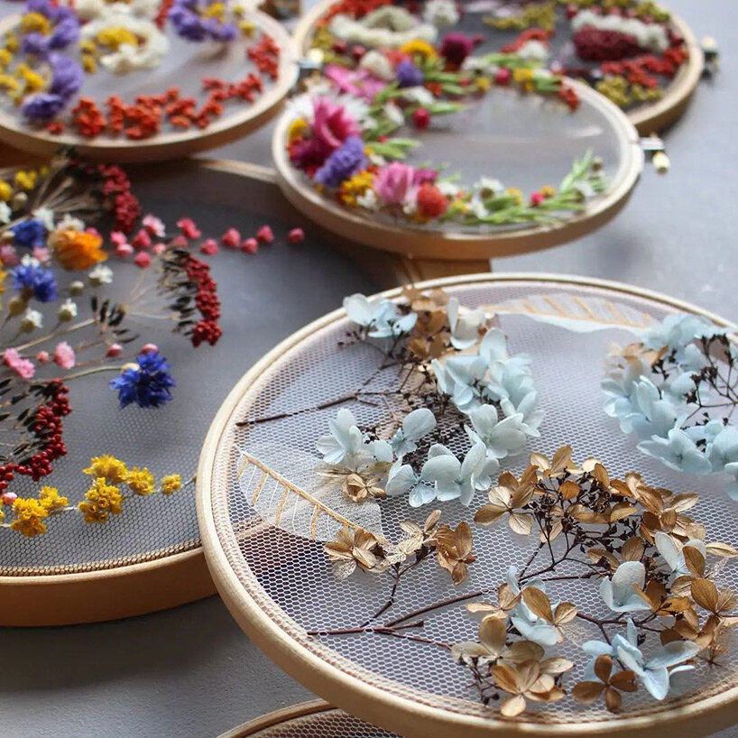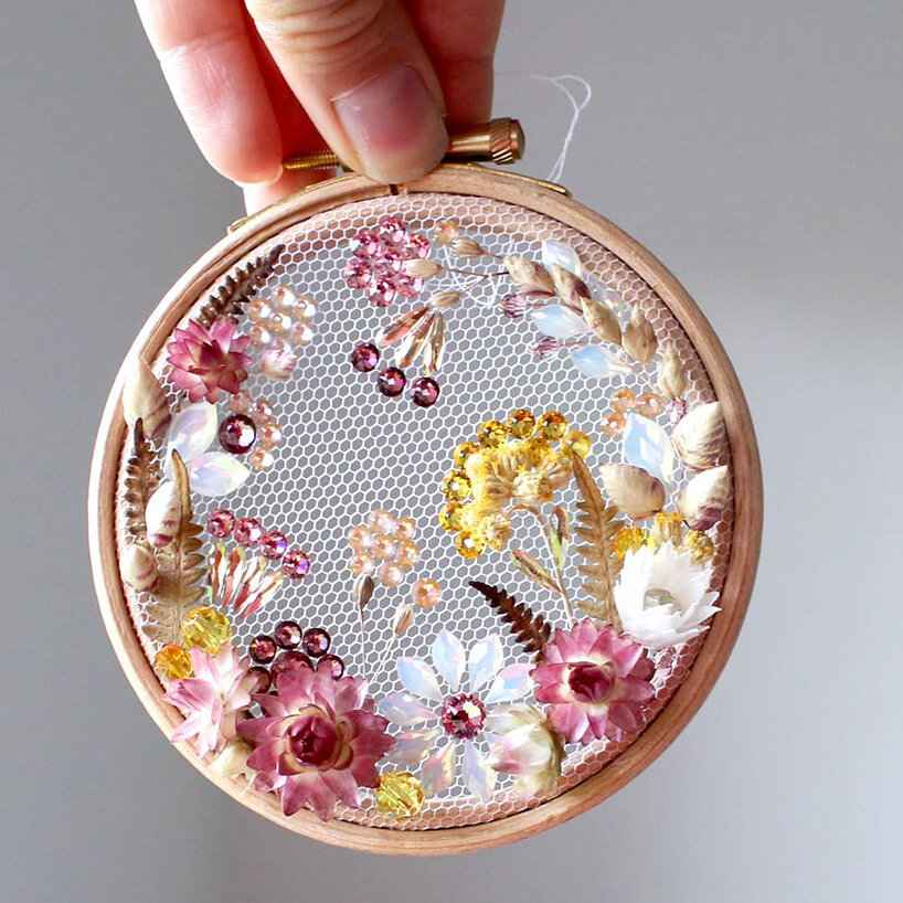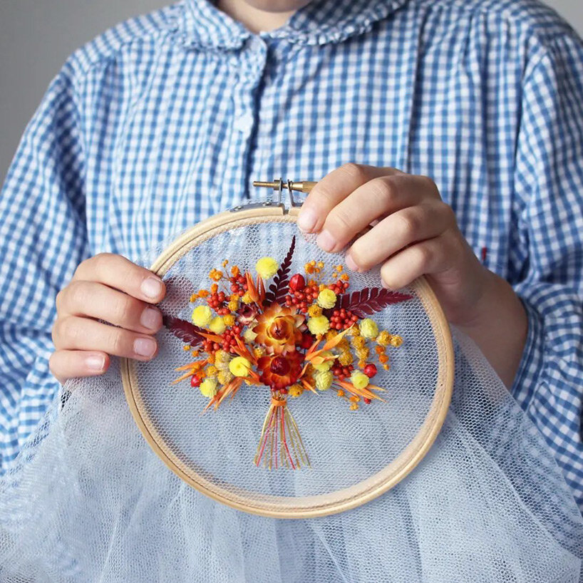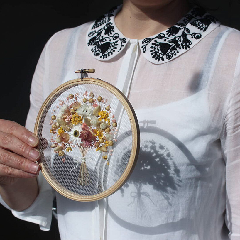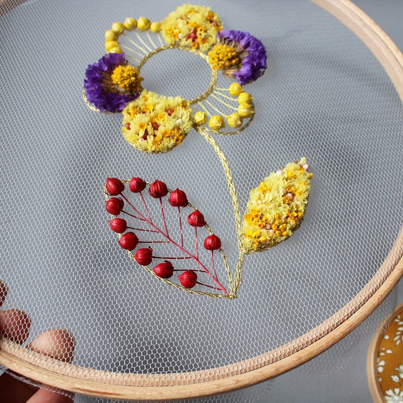 dried flower arrangements blossom from olga prinku's delicate tulle embroidery works