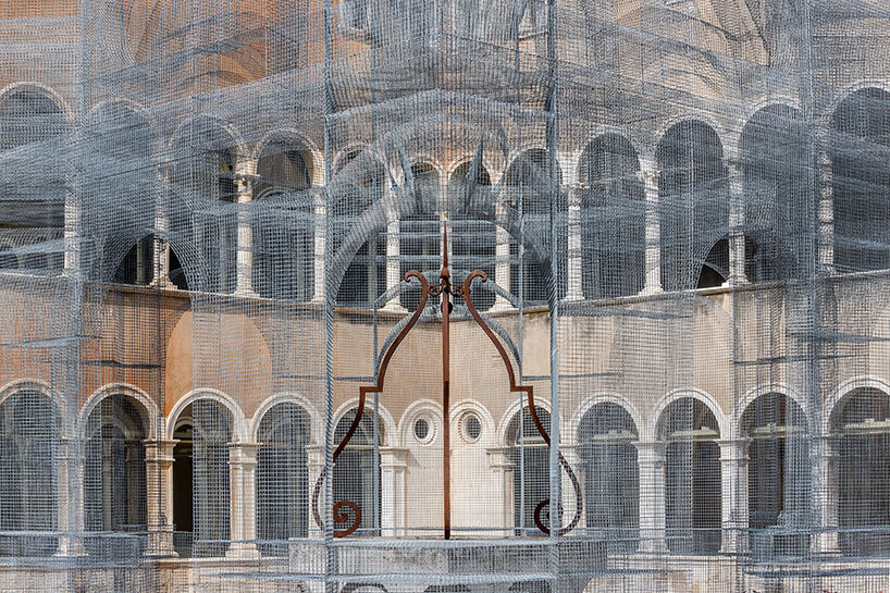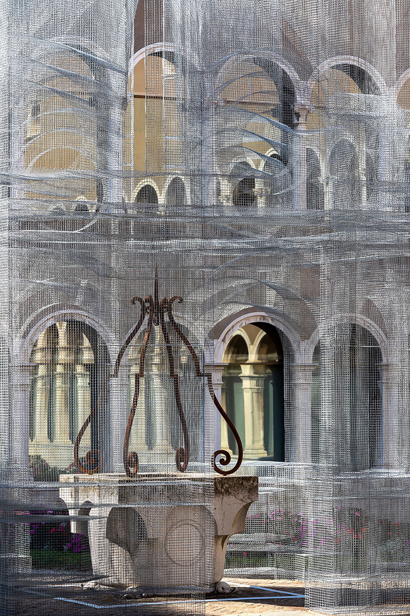 built of wire mesh, edoardo tresoldi’s ‘sacral’ has been installed in the 16th-century cloister of the art museum of the city of ravenna (MAR). the space was originally the canon’s monastery of santa maria in porto which celebrated the greek madonna mentioned by dante in paradiso, the canticle he completed during his time in ravenna. the artist invites visitors to physically enter the enormous sculpture, representing the noble castle and, ‘as if in a performance, to retrace dante’s journey.’