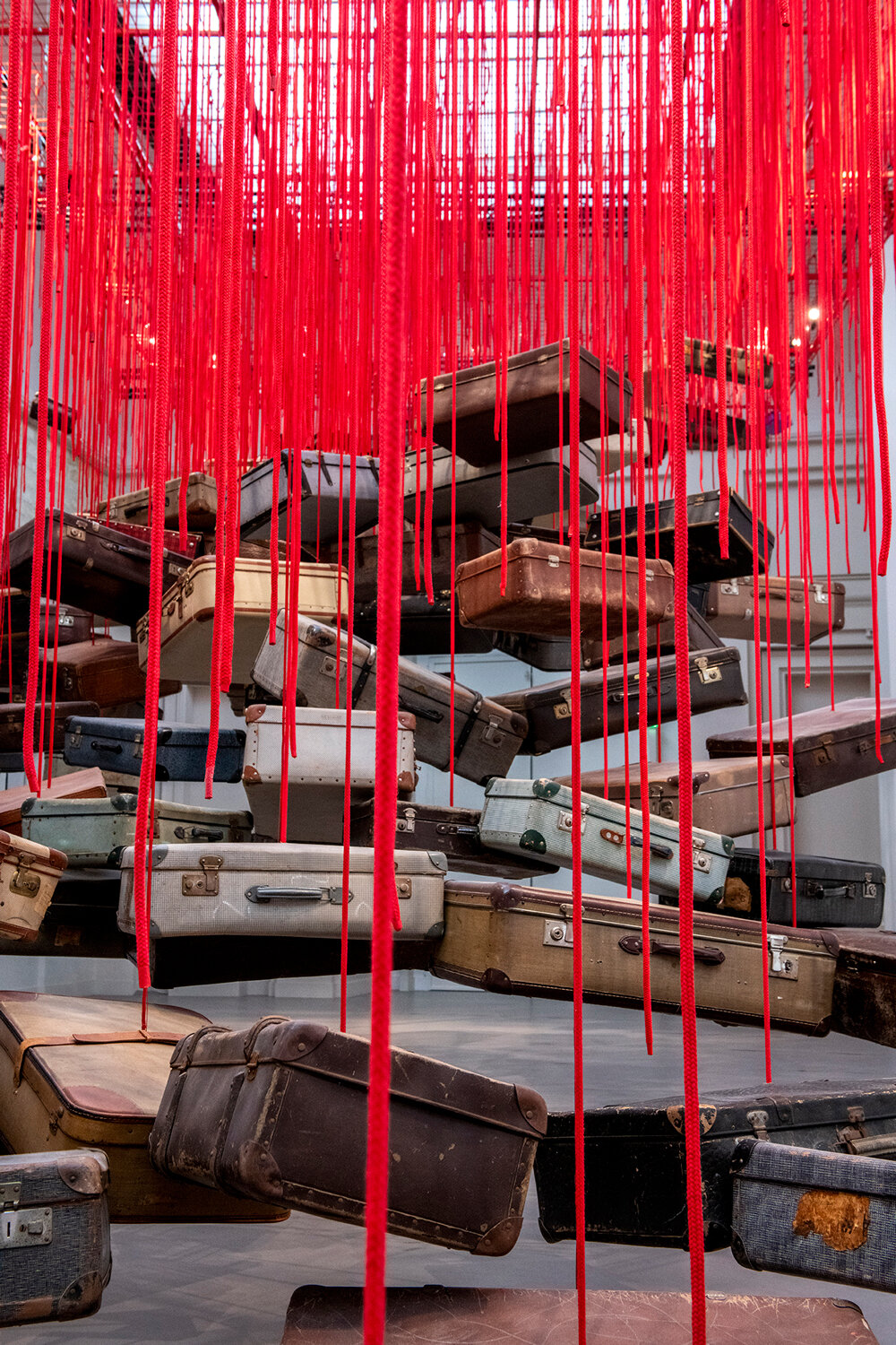 Chiharu Shiota, Accumulation-Searching for the Destination, 2014/2024, suitcase, motor, red rope | view of the exhibition ‘Chiharu Shiota, The Soul Trembles’, Grand Palais, Paris 2024 | Scenography Atelier Jodar © GrandPalaisRmn 2024 / Photo Didier Plowy © Adagp, Paris, 2024 and the artist