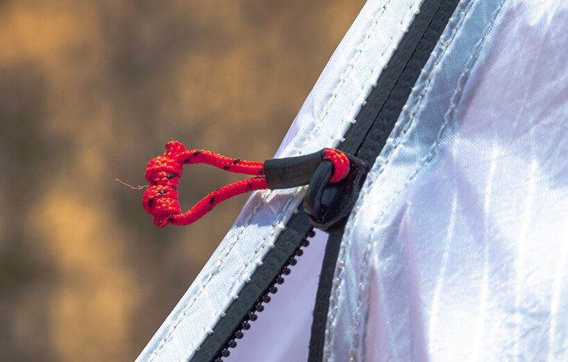 Following completion of use, it can be packed up with ease, folding down into a compact size resembling just a 1.5-liter bottle with a total weight of 872 grams, including stakes. This lightweight effect was achieved by Rafael Amzallah’s careful selection of materials. The rain cover, made from silk nylon ripstop with a 20-denier thickness weighs 27 grams per square meter, while the bathtub tent floor, constructed from silk nylon ripstop with a 40-denier thickness weighs 45 grams per square meter, enhancing durability against harsh terrain. Additionally, the lightweight mosquito net weighs 25 grams per square meter.