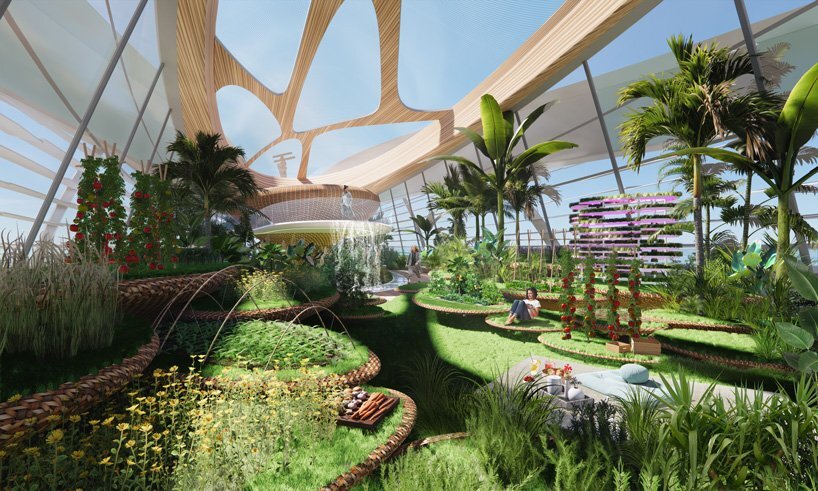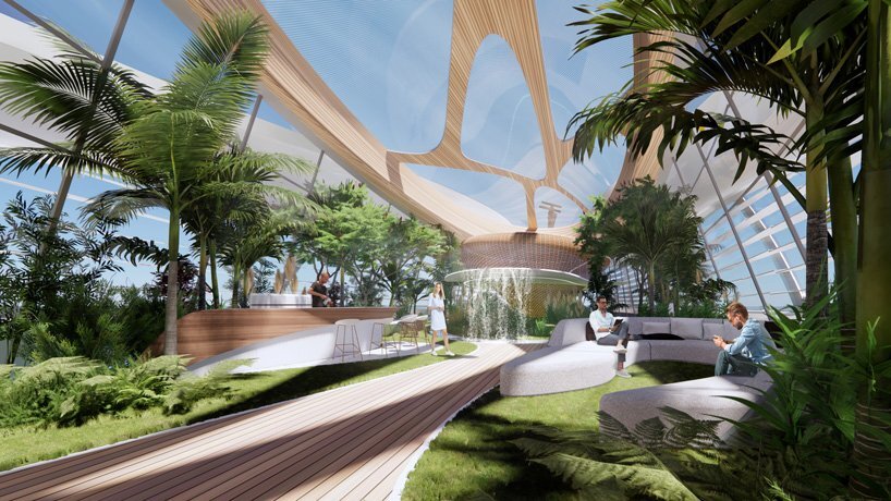 multidisciplinary design practice 3deluxe unveils ‘VY.01’, a zero-carbon superyacht with an ambitious design that combines luxury and technological innovation. the project adopts a nature-oriented philosophy, generating a light-suffused, loft-like space including a greenhouse, lounge living space, kitchen, bar, and vegetable garden. healthy food can be cultivated on-board, and fresh fish can be captured from the ocean, while additional water needed for the plants is made available by the seawater desalination system, powered by the zero-carbon solar panels on the roof and the exterior. relaxation, workouts, online business meetings, celebrations with friends — all this is possible within the inspiring ambiance of the ‘paradisiacal biotope’, as the creators call it.