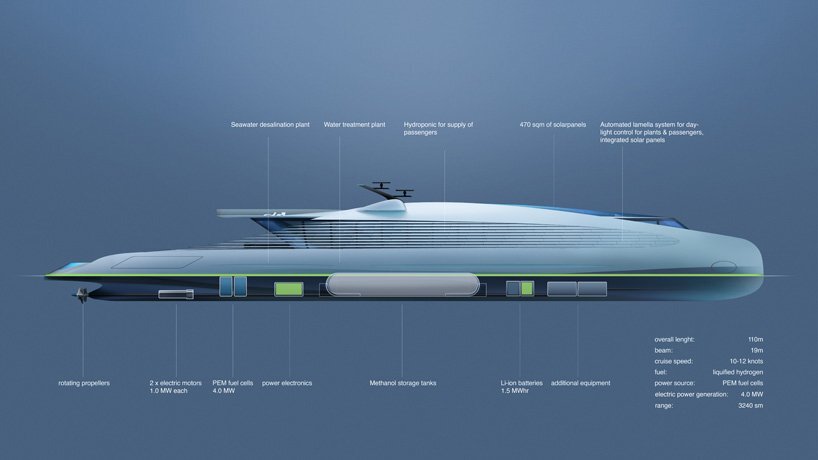 the most attractive and progressive key technology for zero-carbon propulsion of cruise ships and yachts is currently considered to be fuel cells driven by hydrogen. the hydrogen required for the fuel cells can either be refueled or produced locally using methanol from emissions-free production. methanol is more readily available and less complex to handle than hydrogen, and with one full tank of bio-methanol a fuel-cell yacht travelling at slow speed can still cover a distance of 1,000 nautical miles. this technology currently remains expensive, but with the appropriate maturity and greater prospects for marketing, it will become increasingly affordable for commercial shipping. the silent electric engines, which can be distributed decentrally throughout the ship, also avoid any outward noise pollution, while the interior of the ship would likewise be unusually quiet and free of vibrations.