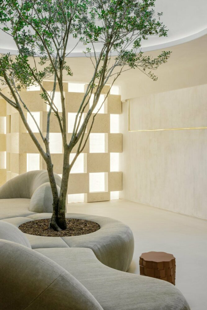 the project sits like a ring placed over the terrain, with its funnel-like roof forming a shaded perimeter walkway and an introverted core.